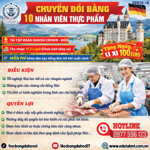 Chương trình Chuyển đổi bằng Đức ngành chế biến thực phẩm đang tuyển 10 ứng viên làm việc tại nhà máy thuộc Tập đoàn Danish Crown – một trong những tập đoàn thực phẩm hàng đầu châu Âu. Đây là cơ hội việc làm hợp pháp tại Đức với mức…