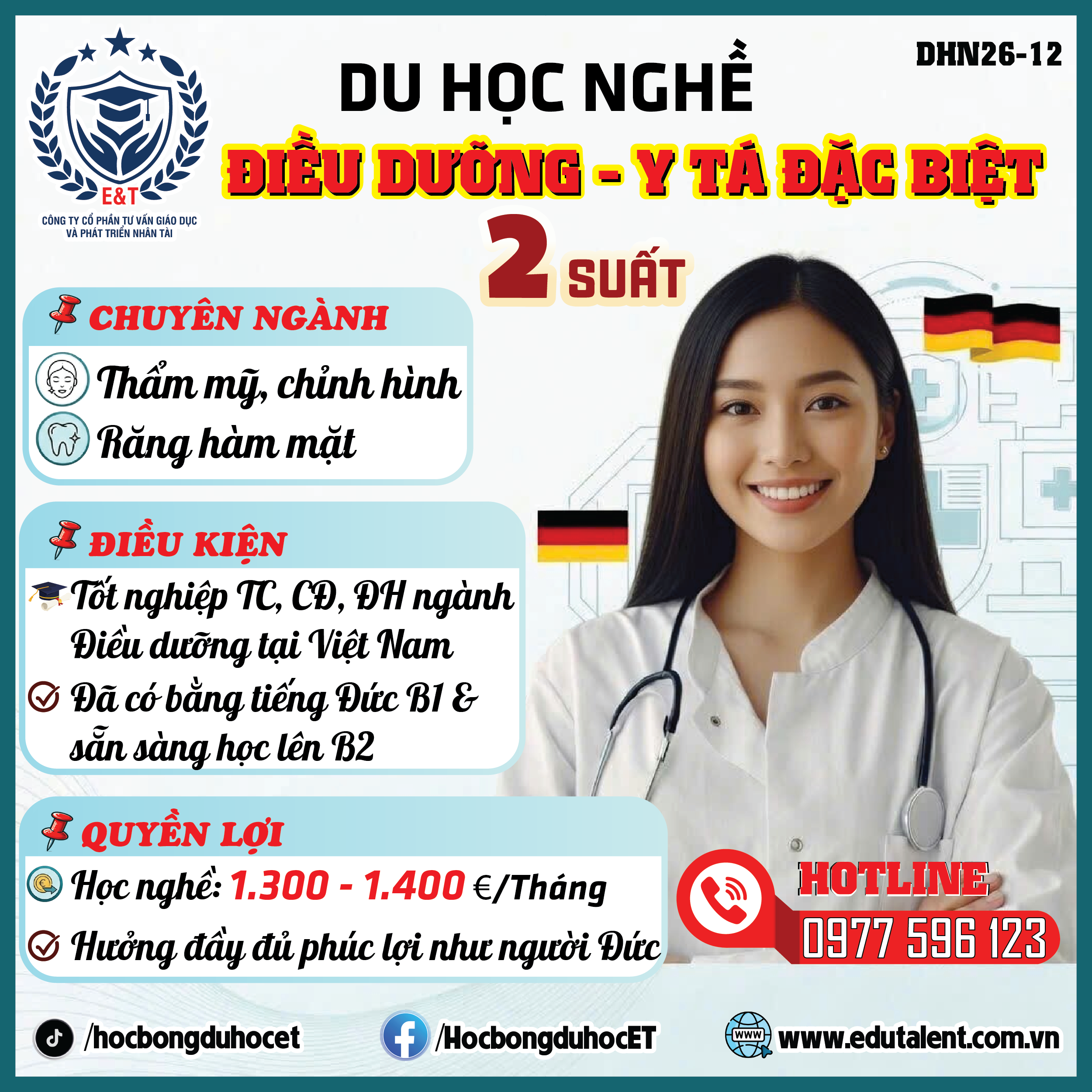 Đây là cơ hội hiếm có dành cho 02 ứng viên xuất sắc nhất tham gia chương trình Du học nghề Điều dưỡng đặc biệt tại Đức – chuyên ngành Thẩm mỹ, Chỉnh hình & Răng hàm mặt, nhập học vào tháng 9/2026.